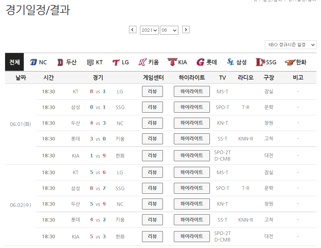 # 10구단 2021-06-01 ~ 2021-06-13 까지의 경기 기록 저장 saveGameResult(kbo_teams)승패 데이터 수집이 완료되었으면 코퍼스 데이터 수집을 시작한다.
