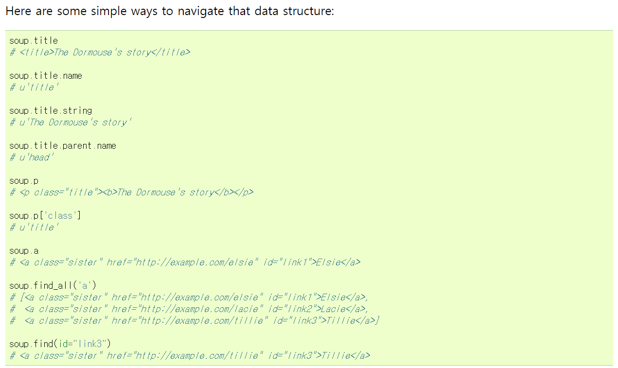 from bs4 import BeautifulSoup soup = BeautifulSoup(response.content) # 별다른 지정을 안 해줄 경우 html parsor로 파싱됨 # bs 객체를 이용해 필요한 부분만 가져옴 trs = soup.tbody.find_all('tr') title_list = [] for tr in trs: td = tr.find('td', class_='제목과 대응하는 클래스 이름') title = td.a.text title_list.append(title) title_listOutput