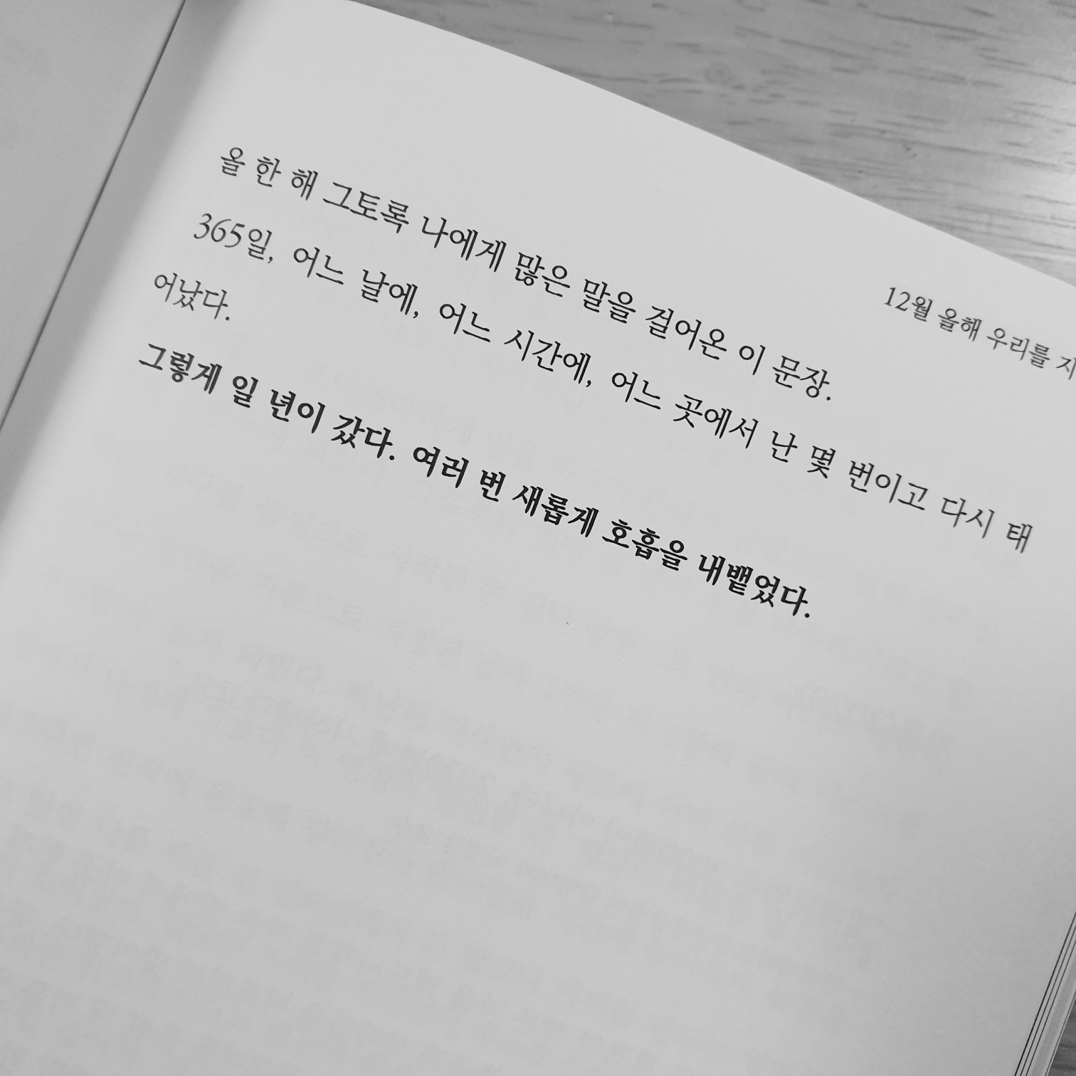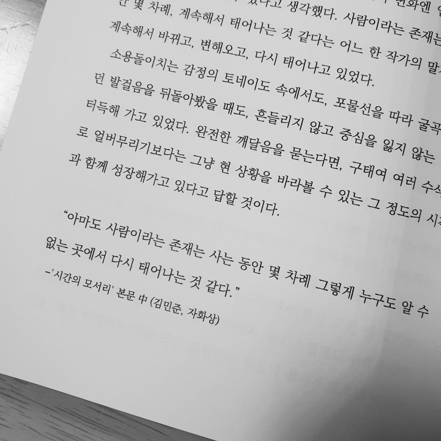 에세이 <스물셋, 마침>의 '환생' 中 "사람은 고쳐쓰는 거 아니다"오래된 말을 향한 맹목적 믿음,거기에서 수반된 자기 학대.이젠 이 말을 놓아줄 때가 온 것 같다.2021년 속에서, 나는 수없이 죽고 다시 태어났으니