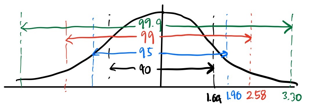 표준정규분포에서 각 신뢰구간 별 신뢰 수준과 그에 해당하는 Z값 저 신뢰 구간 식은 어떻게 해서 나왔는가?