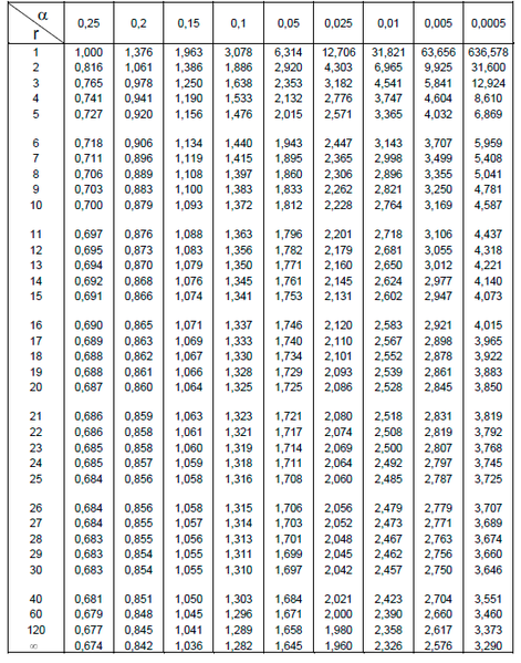 열($\alpha$)은 유의 수준, 행(r)은 자유도이다. 만일 내가 20개의 표본을 추출했을 경우 단순 선형회귀이므로 자유도는 20-2 = 18이 된다. 행에서 18을 찾고 유의 수준이 0.05이므로 열에서 0.05를 찾은 후, 둘이 만나는 지점의 값이 바로 기준값의 t-statistic이 된다.