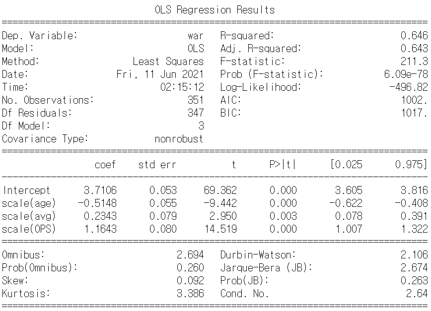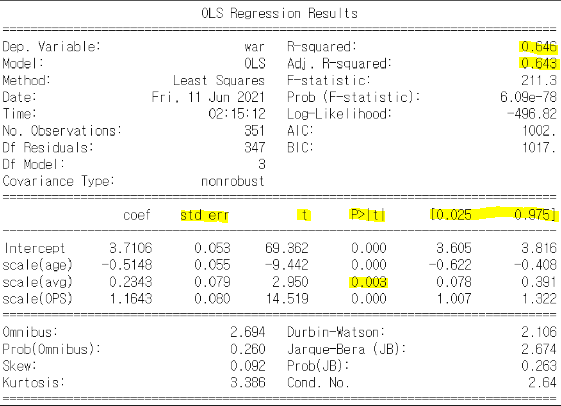- P > |t| : p-value. 역시 예상했던 대로 다른 coefficient들은 zero에 가까운 값이 나왔는데, avg만 0.003이 나왔다. 꽤나 낮은 값이라 다행히 귀무 가설은 기각되었지만, 여전히 의구심이 남는다. 나이와 타율 중, war(대체 선수 대비 승리 기여도)와 더 연관이 있는 건 직관적으로 보면 당연히 후자일 텐데 왜 p-value는 전자가 더 낮게 나왔는지... 물론 p-value가 각 coefficient의 설명력을 말해주는 수치가 아님은 아주 잘 알고 있다. 다만 선형 회귀를 많이 다뤄보지 않아서 조금 알쏭달쏭하다. 이것도 공부를 더 하면 자연스레 받아들일 수 있을까.