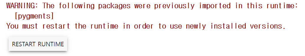 !pip install jedi # 얘 안해주면 pip warning 어쩌고 뜨는듯 !pip uninstall pygments==2.6.1 !pip install pygments==2.14.0문제 상황
