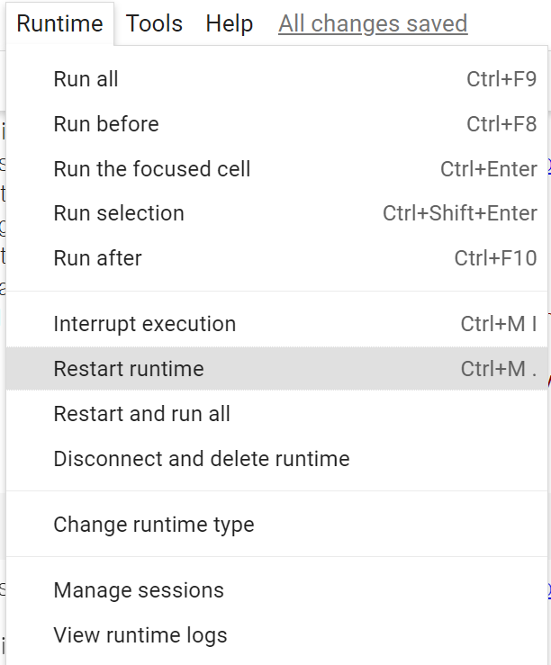 runtime을 restart할 경우 local variable 같은 정보는 사라지지만, 현재 환경 정보 (내가 설치한 모듈 버전 등) 은 갱신되게 된다.